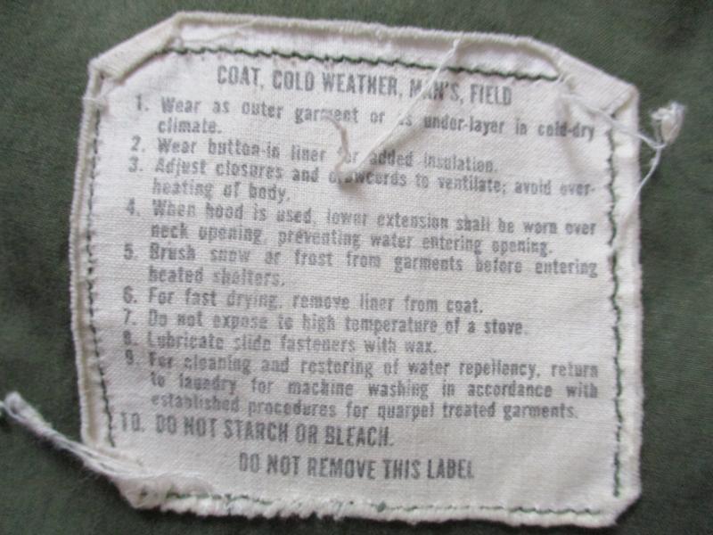CONDITION = ITS VINTAGE 52 YEARS OLD , it looks real good one to me of the best u will find i think ..its got some small cut holes on right chest from wear soliders name tape was taken off its ok like this or a new name tape would cover them up , one small dark spot on back below collar shown in picture . no other holes rips etc i can see or find . hem draw cord taken out but easy to fit your own if you , looks a real good 1 . please study all pictures .S