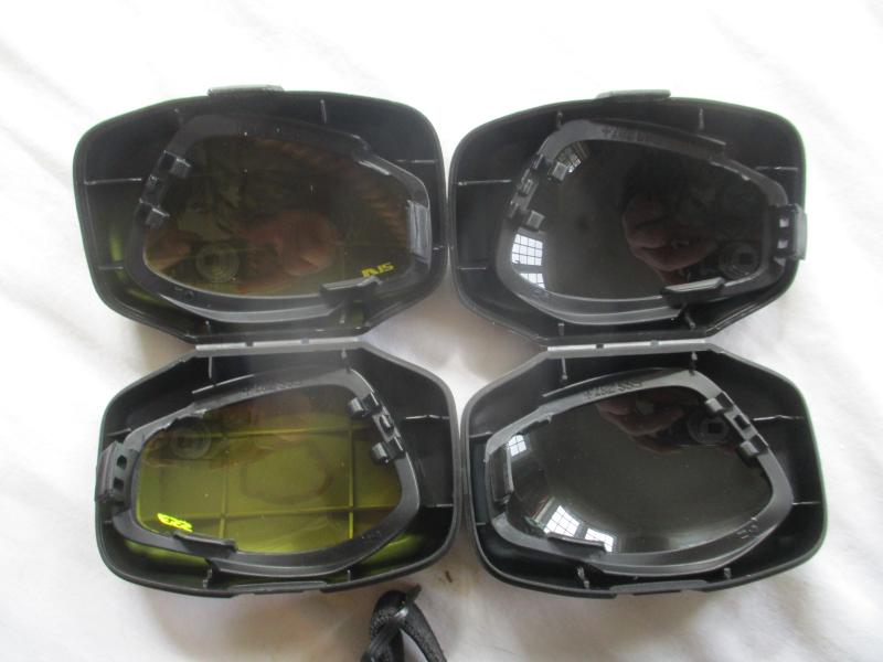 THE V12 COMBAT GOGGLES = THEY HAVE ADJUSTABLE HEAD STRAP AND LENS PROTECTIVE COVER TO STOP SUN GLARE OF LENS WHEN NOT WORN AND THIS CAN BE POLISH CLOTH AS WELL , 2 SPARE LENS IN POD , BLACK , YELLOW AND CLEAR . AND COME WITH A PROTECTIVE CASE for the ess V12 COMBAT GOGGLES WITH 2 VELCRO OPENING BELT LOOPS THAT VELCRO TO FIT ON MOLLE LOOPS AND PLASTIC SNAP HANGER CLIP . ONE MAIN COMPARTMENT AND 2 SMALLER ONES TO HOLD LENSE PODS IN