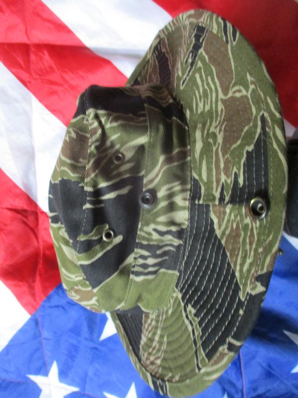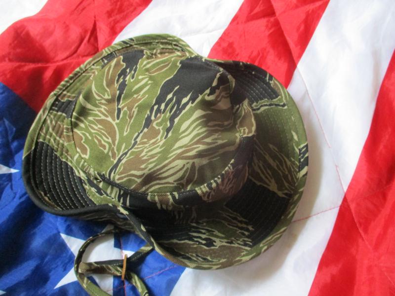 A SANTA MARIA CO BOONIE HAT . VIETNAM WAR JWD JOHN WANE TIGER STRIPE CAMO ..closest to original there is it wears in n sun fades into awesome shade ..