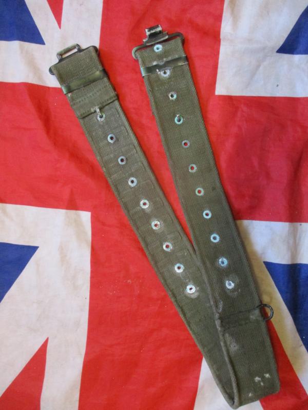 FEATURES = A 100% GENUINE ISSUE 58 BELT A CLASSIC BIT OF KIT , WORN WITH 58 WEBBING OR ON ITS OWN OVER PARA SMOCK OR COMBAT JACKET OR DENISON SMOCK ..STILL WORN BY PARATROOPERS TO THIS DAY OVER PARA SMOCK IN WORKING DRESS ...FULLY ADJUSTABLE FOR FIT WITH INNER C HOOKS , 2 REAR D RINGS TO FIX PONCHO ROLL TO .
