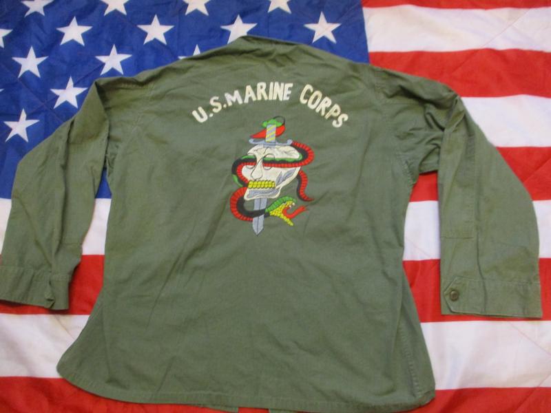 AND A ONE OFF THIS ONE ITS GOT a VIETNAM WAR STYLE US MARINES EMBROIDED LOGO ON THE BACK ...JUST LIKE VIETNAM VETERANS WOULD HAVE DONE