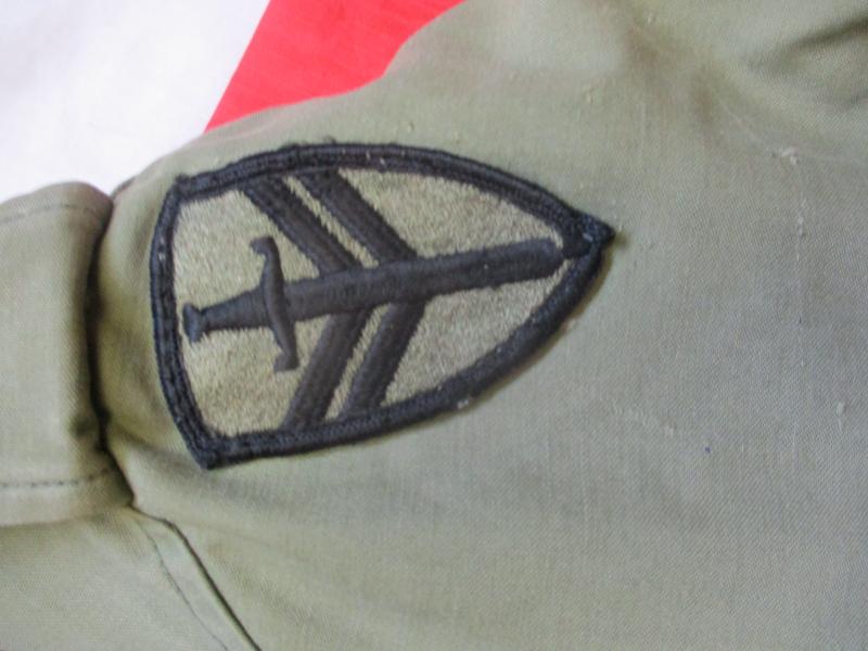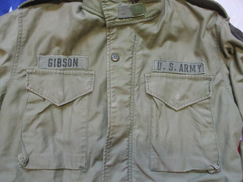 INSIGNIA = ALL ORIGINAL TO THE COAT AND ALL VIETNAM WAR PERIOD . MACHINE SEWN ON . U.S.ARMY BRANCH TAPE AND NAME TAPE GIBSON . AND THE LEFT ARM DIVISION PATCH AND UNDER IT CAN BE SEEN WERE A TRIANGLE SHAPE ONE HAS BEEN ID SAY A ARMOURED DIVISION , SO ID SAY SOLIDER HAS CHANGED UNITS OR BEEN A RE ISSUE M65